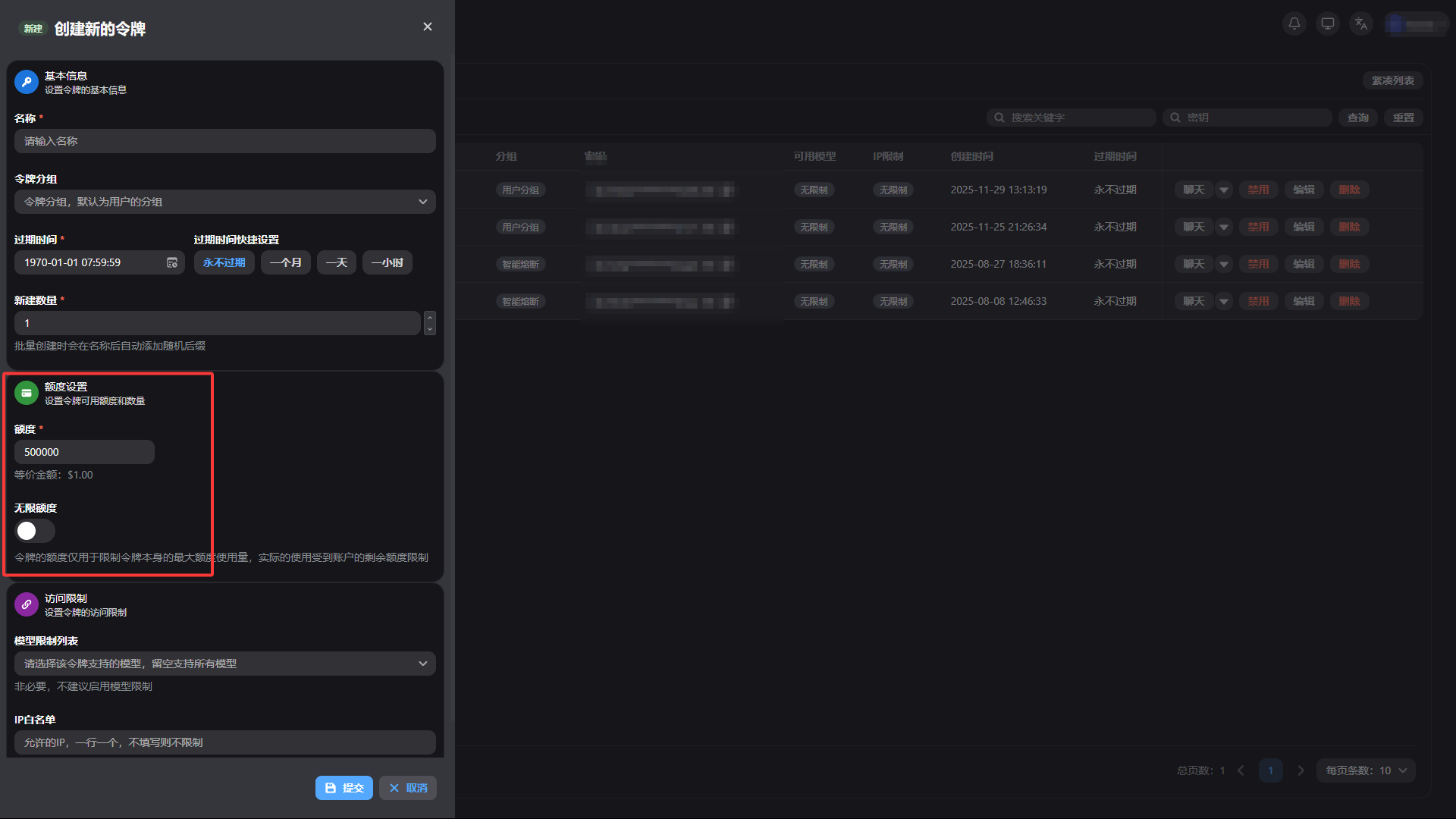 该填的填,额度按需设置,可以直接无限。令牌一会需要用。
