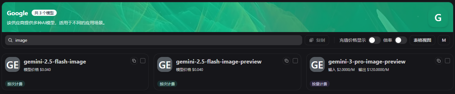 价格如下,gemini-3-pro-image-preview即 Google Nano Banana Pro 会贵的多,博主一般画一张系统架构图3¥左右。